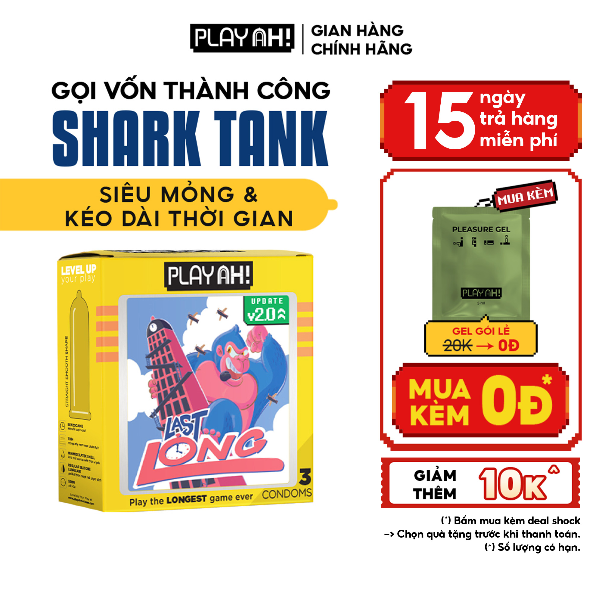 - Bao cao su PlayAh Last Long Siêu Mỏng chính hãng với Benzocaine giúp kéo dài thời gian yêu, là bcs chống xuất tinh sớm khiến khoảnh khắc bên nhau là vô tận.
